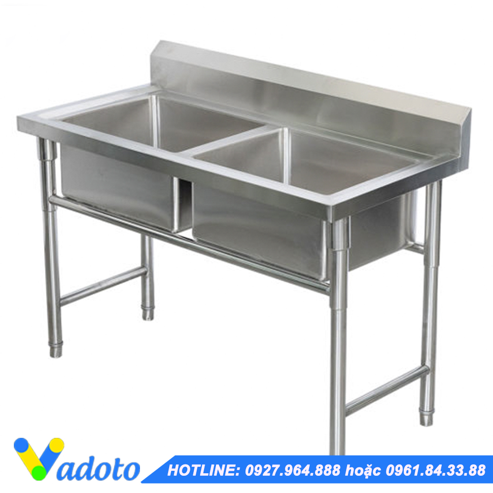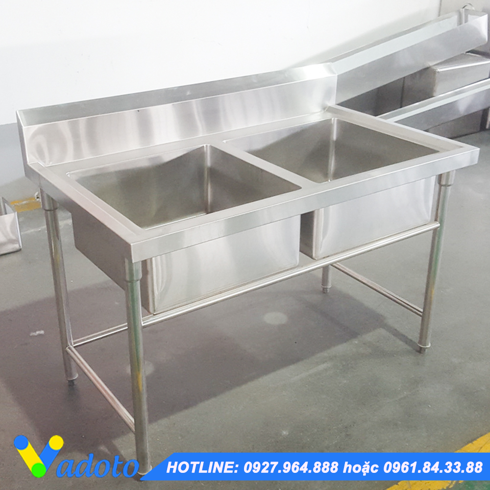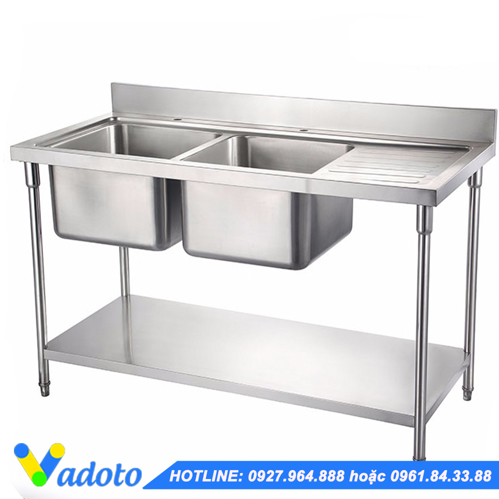 Chậu rửa đôi có giá nan bên dưới và có bàn phụ bên phải: