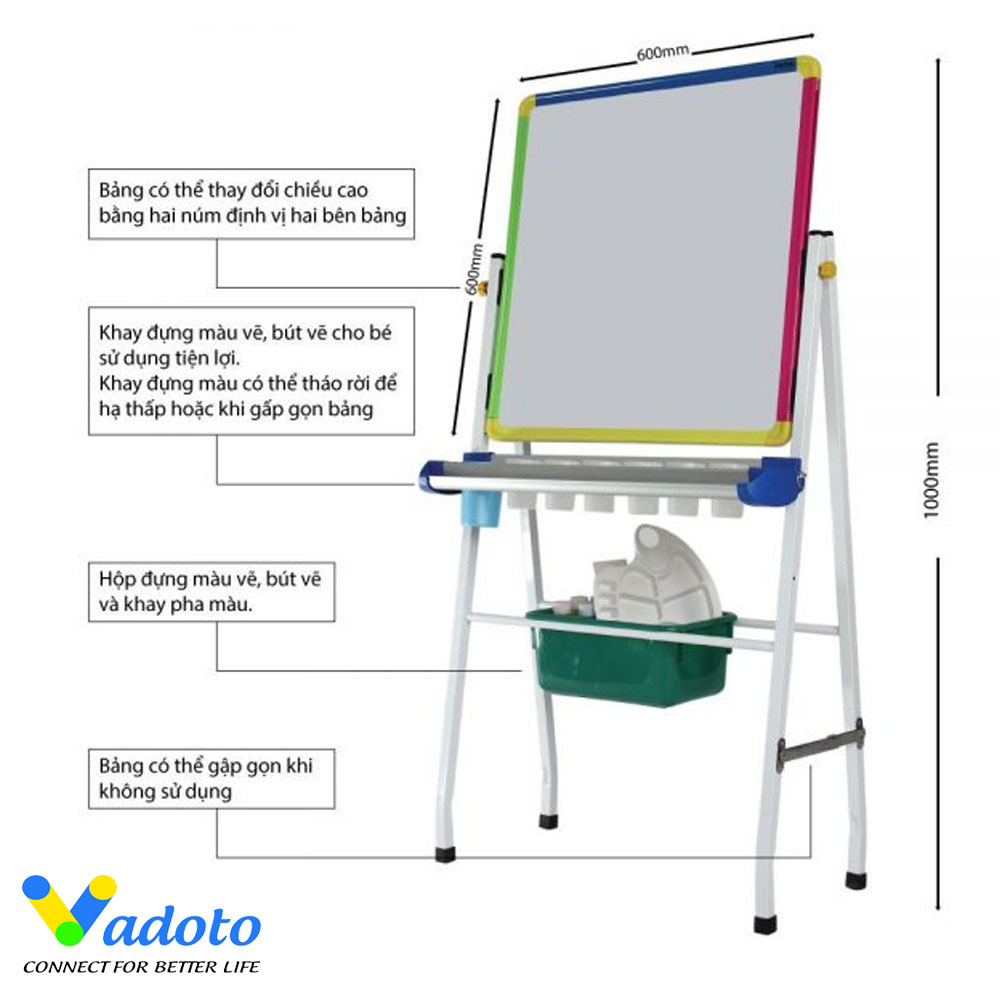 + Bảng giá vẽ có 2 mặt. Một mặt bảng là mặt từ trắng Hàn Quốc có từ tính, vừa viết bút dạ lên mặt bảng, vừa đính được bộ chữ cái, giấy vẽ bằng các viên nam châm. Một mặt là bảng từ xanh viết phấn.