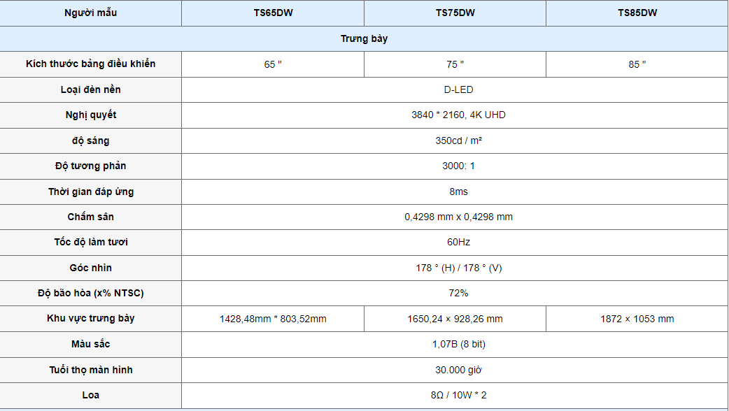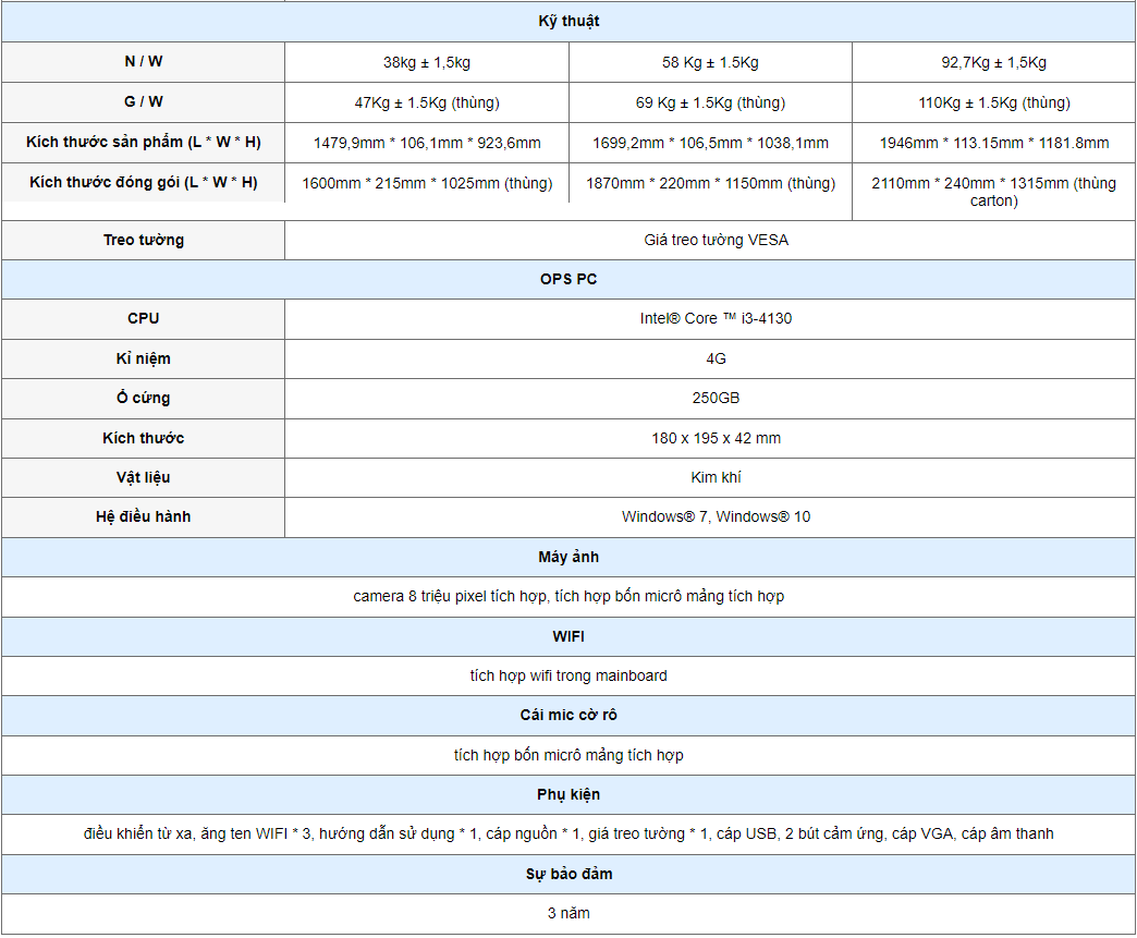 * Thông số kỹ thuật củaBảng điều khiển phẳng tương tác :
