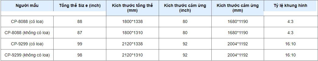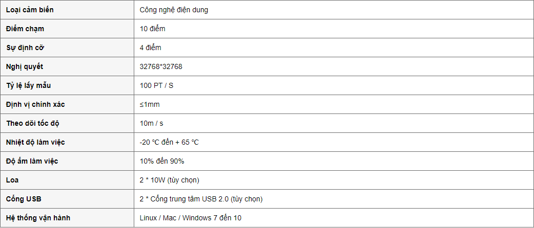 * Thông số kỹ thuật của Bảng trắng tương tác điện dung - 10 người dùng (CP) :
