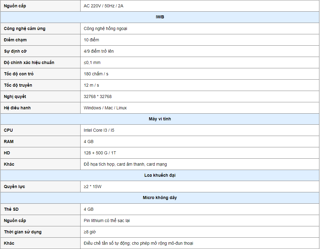 * Thông số kỹ thuật của Hệ thống bảng tương tác tất cả trong một :