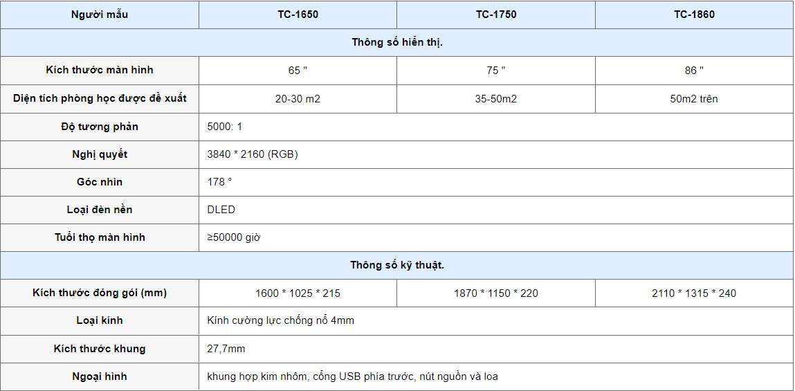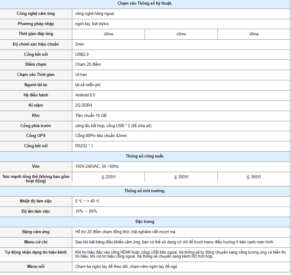 * Thông số kỹ thuật của Màn hình tương tác thông minh: